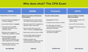 El proceso de examen de CPA es una asociación entre las juntas estatales de contabilidad, el Instituto Americano de Contadores Públicos Certificados, la Asociación Nacional de Juntas Estatales de Contabilidad y Prometric. Consulte esta tabla para obtener más detalles.